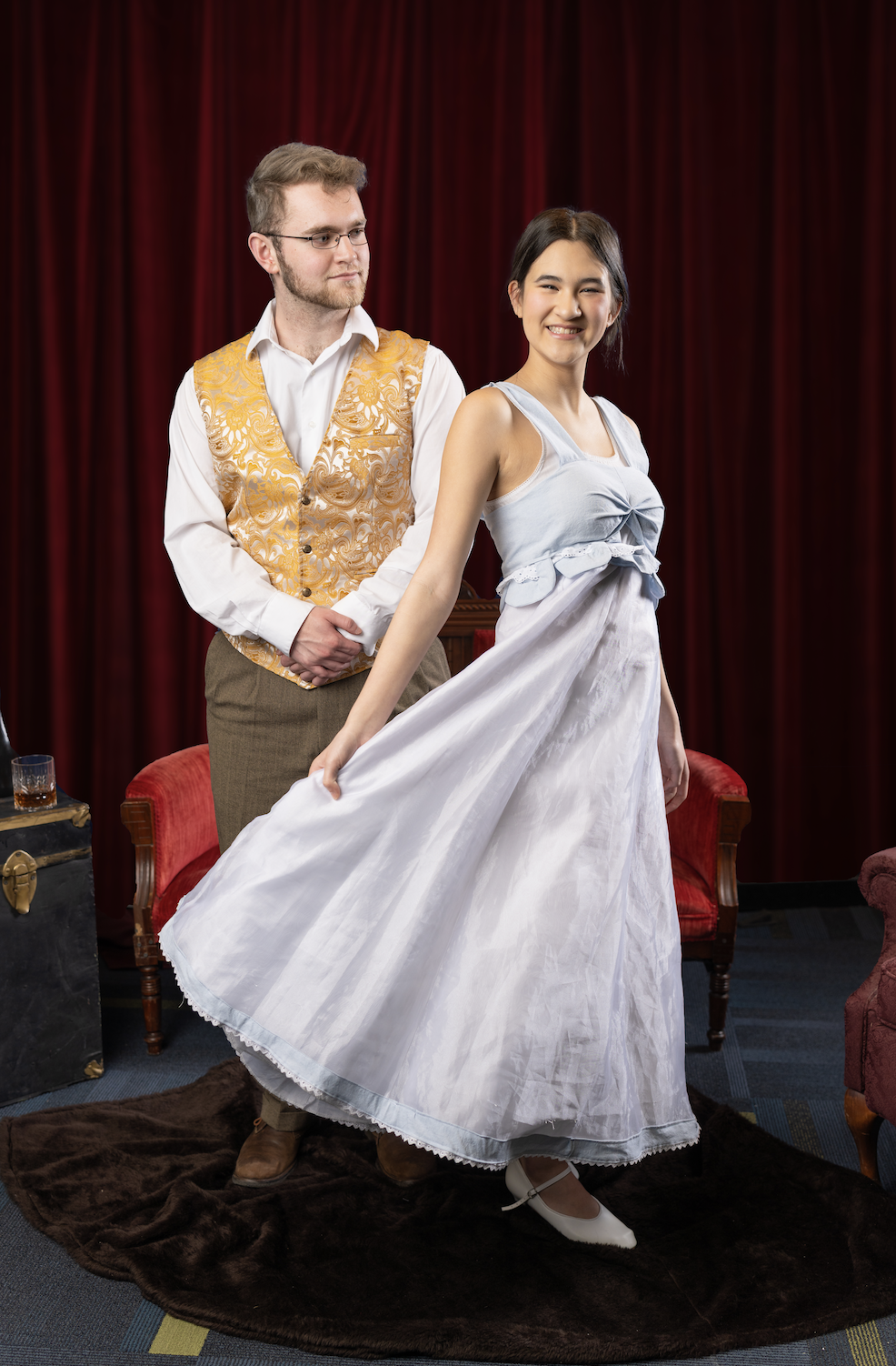 After everyone had finished hurriedly completing last-minute chores, the cast proceeded with the first part of rehearsal: the costume parade. Now, if you’ve never been involved in theatre, the idea of a costume parade might sound strange, but it’s exactly what it sounds like. Cast members put on their costumes and “parade” onto the stage in front of the director and costumers to ensure each cast member looks just right. In this case, students paraded across the stage in a series of various Russian-themed outfits as the artistic director, Amy Patel, gave notes on each costume piece, and a student costumer gave justifications for her various choices and offered suggestions on how things could be made more authentic. Though it was a long and tedious process, I was impressed with how the students stood still, waited their turn, and took direction—only having to be reminded once to stay quiet as “this was the hard work of theatre.”
