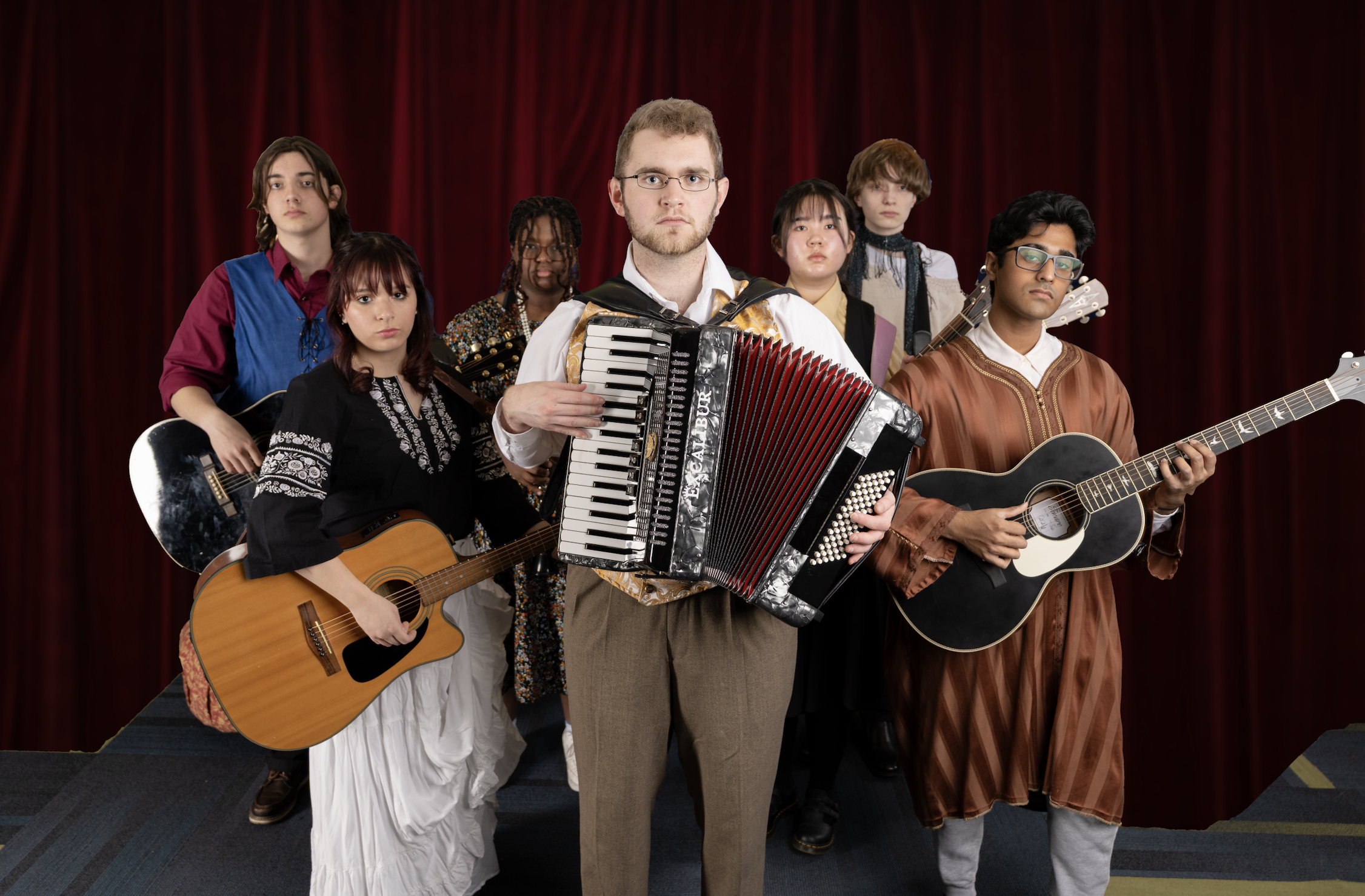 Simon Tsikalas as Pierre and various ensemble musicians (Left to Right: Connery Patel, Gracyn Dardón, Avery Shaw, Nia Kipp, Tony Comer, Rakshan Baskaran)