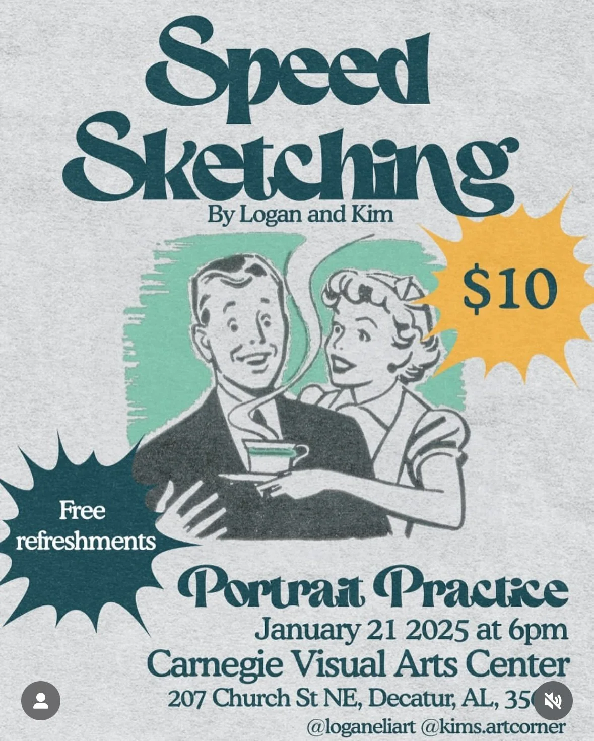 The next Speed Sketching event will be held at 6:00 PM on Tuesday, January 21, at the Carnegie Visual Arts Center in Decatur and is open to all, from beginners to experts. This particular iteration will feature portrait practice. Logan and Kim hope that attendees silence their inner critic and prepare to fully engage in quick, time-limited portrait drawing exercises. Following a quick warm-up, Logan and Kim will have attendees draw each other to improve everyone’s facial composition skills.